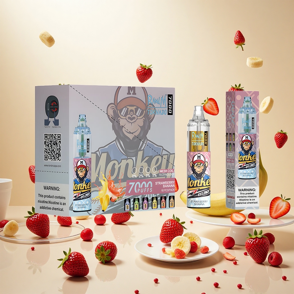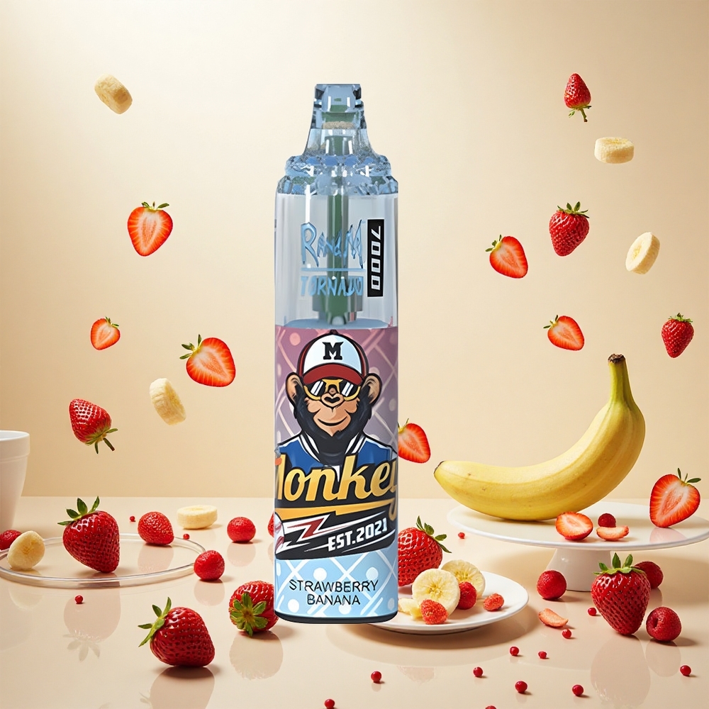 RandM Fumot Tornado 7000 Puffs Engangs Vape Jordbær Banan med 14 ML E-væske