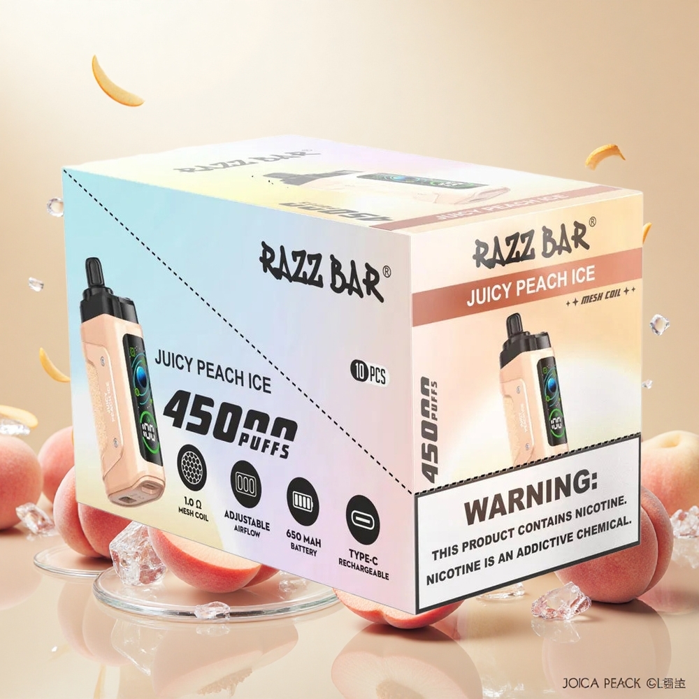 Razz Bar 45000 Puffs Disposable Vape Juicy Peach Is Opptil 45000 Puffs 1.0 Ohm Mesh Coil Justerbar Luftstrøm 650 mAh Batteri Type-C Omladbar 20 mg/ml Nikotinstyrke